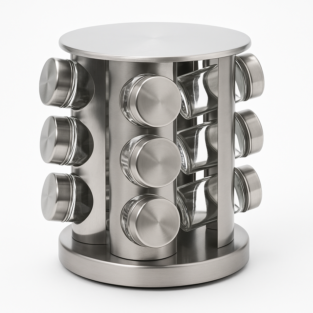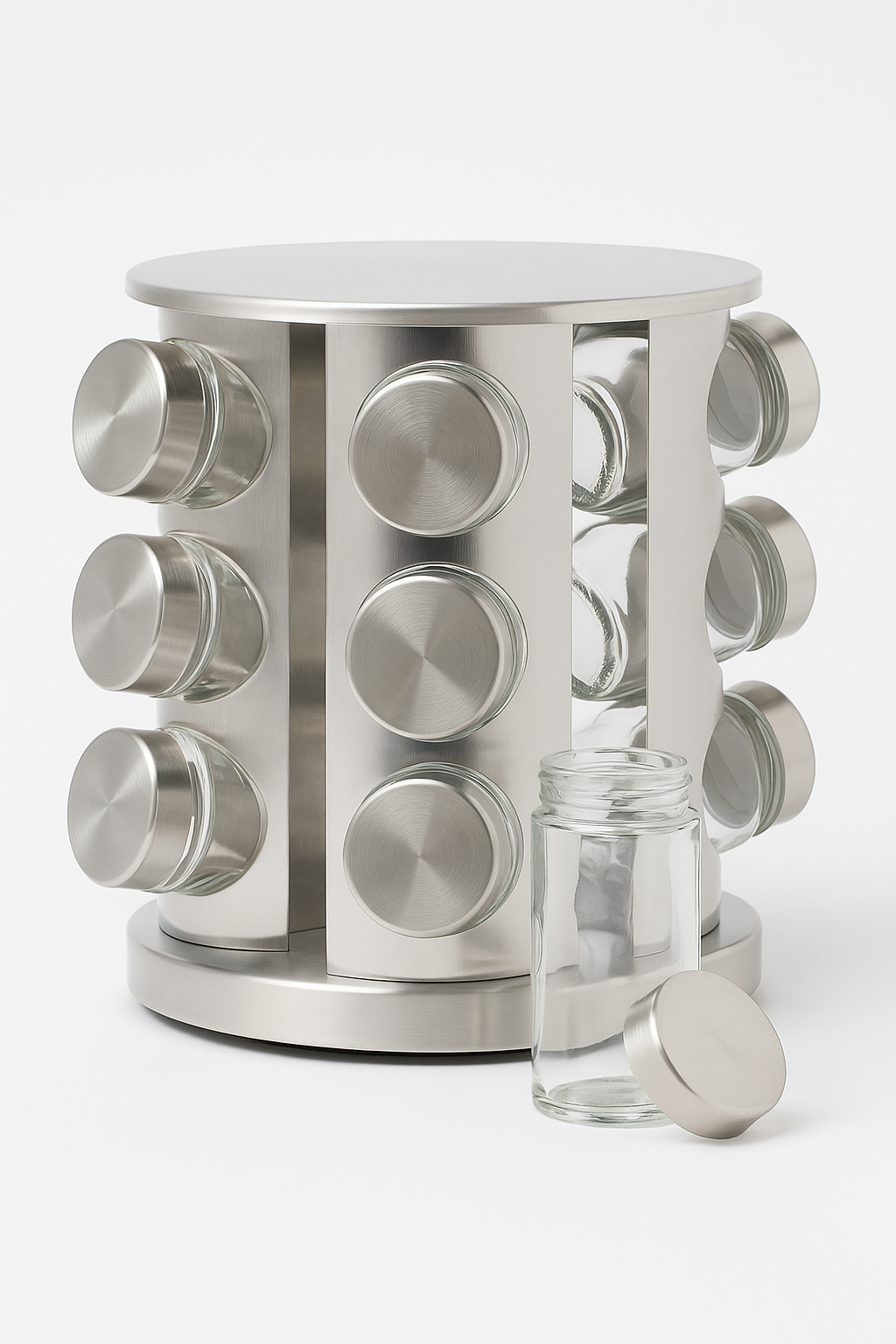 Porque fue pensado para hogares colombianos que aman cocinar pero también valoran el orden y el diseño. Su estructura resistente en acero inoxidable y sus frascos de vidrio de alta calidad te garantizan durabilidad y estilo. No es un simple organizador, es una herramienta de transformación para tu cocina.